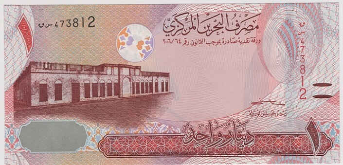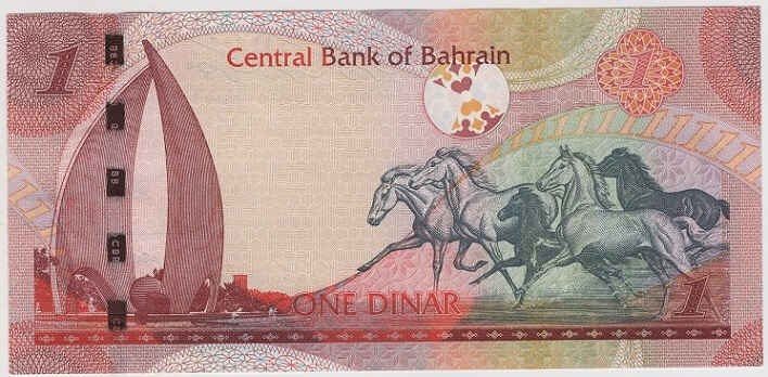 The 1 Bahrain Dinar note, issued in 2016, has dimensions of 155 x 74 mm. The obverse features the Al Hedya Al Khalifya School in Muharraq, while the reverse features a galloping Arabian horse and the Candle and Pearl monument.