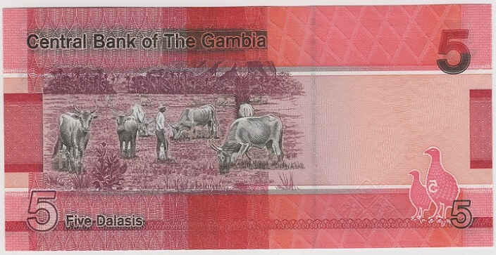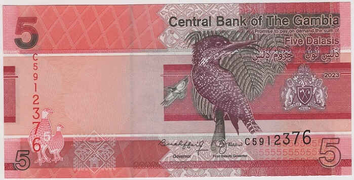 Gambia’s 5 Dalasis note, issued in 2023, features an image of a giant kingfisher on the front next to the country’s coat of arms. On the back, there is a scene of a man tending cattle in a field. The predominant colors are red and orange. This banknote is part of the current “Birds” series, with security features such as a pearl stripe on the back and a solid security thread with demetalized “CBG 5”. The paper is watermarked with a crocodile head and the number 5.
