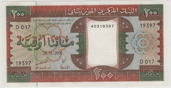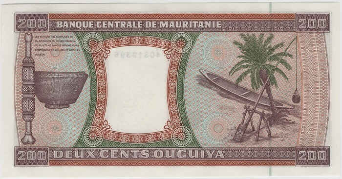 Mauritania’s 2002 200 Ouguiya note, issued by the Central Bank, highlights the country’s culture and economy. In shades of blue and green, it features Islamic motifs, scenes of fishing and rural life. Includes security features such as watermark and built-in wires. Arabic and French text reflects your cultural heritage.