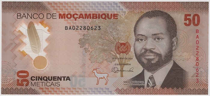 The 50 Mozambique Meticais note, launched in 2024 as part of the new banknote series, is made of polymer and features several technological upgrades. On the obverse, there is a portrait of Samora Moisés Machel, the country’s first president, as well as a tree and an antelope. On the reverse, an antelope in the savannah, cave paintings of hunters, and the map of Mozambique stand out. The design celebrates Mozambican fauna and cultural heritage, with an emphasis on safety and accessibility, including elements to facilitate use by people with visual impairments.