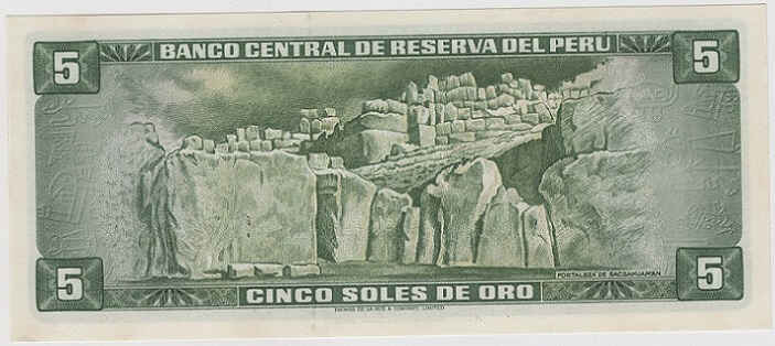 The 1974 5 Soles note from Peru features historical and cultural themes. Issued by the Central Reserve Bank, it is a standard size (155 x 65 mm) and has graphic elements typical of the time.