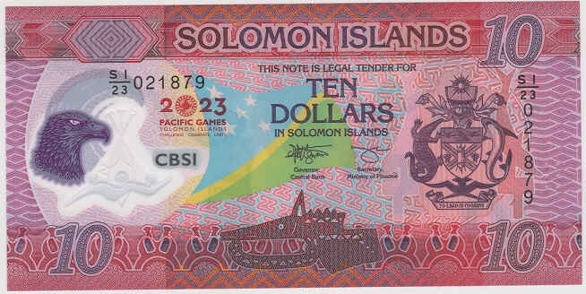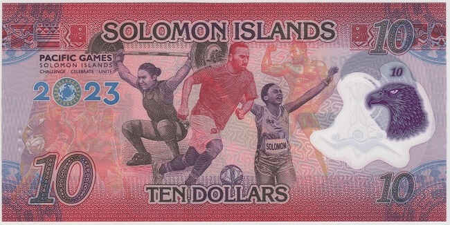 The 2023 Solomon Islands $10 note commemorates the Pacific Games in Honiara. With dimensions of 135 x 66 mm and made of polymer, on the obverse it features an emblem with three oars, an eagle, the coat of arms and the flag.