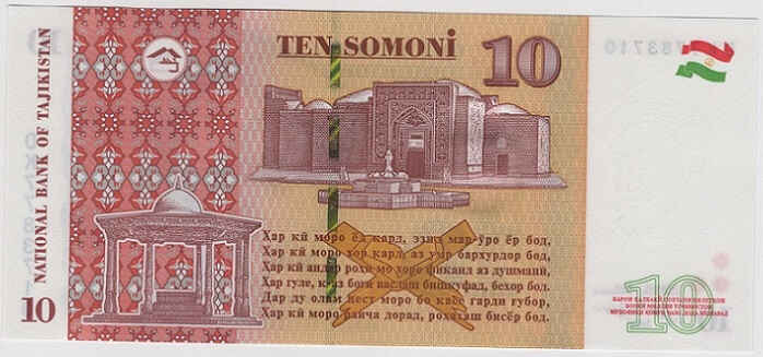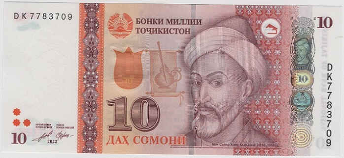 The 10 Somoni banknote from Tajikistan, dated 2022, features on the obverse the portrait of the thinker and poet Mir Sayid Alii Hamadonī (1314-1384), accompanied by a tray of ink and paper. On the reverse, the mausoleum of Hamadonī in Kūlob and the national flag of Tajikistan stand out. The note is printed on paper and has dimensions of 147 × 65 mm.