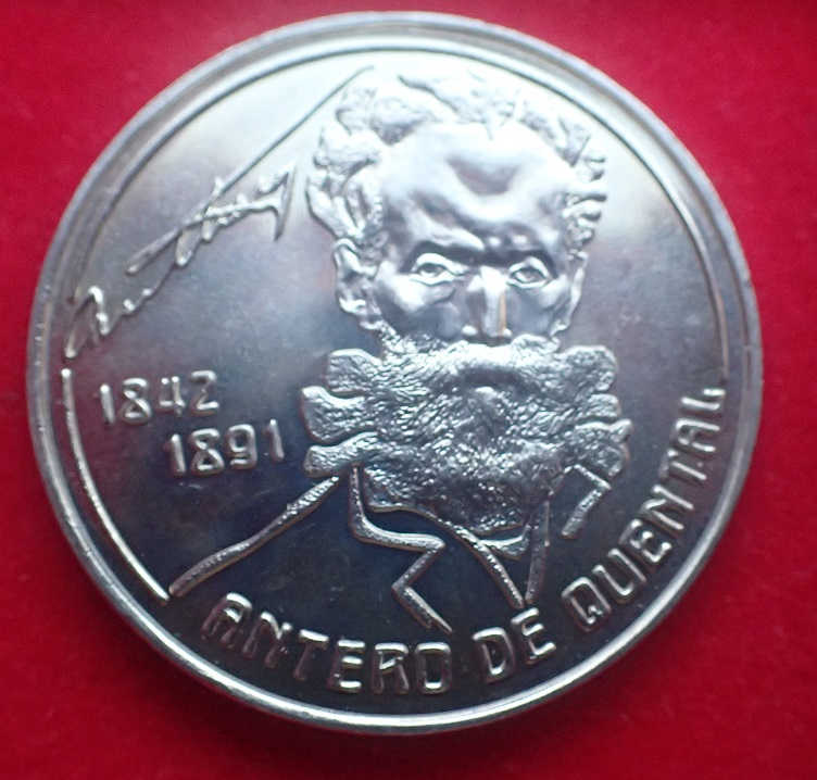 Minted in cupronickel, measuring 36 mm in diameter and weighing 24 grams, this coin follows the pattern of commemorative coins of the time, standing out for its sober and elegant design, which reflects the seriousness of Antero’s life and work.