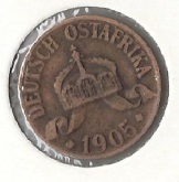 The 1905 German East African 1 Heller coin has a diameter of 20 mm and a weight of 4.5 g. The circulation was 3,760,000 copies.