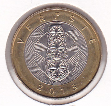 Lithuania’s 2013 2 Litai coin celebrates the spinning wheel (“distaff”), a symbol of tradition and craftsmanship. Made from a copper and nickel alloy, it weighs 5.8g, measures 25mm in diameter and has fine details.