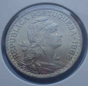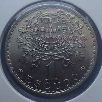 The Portuguese 1 escudo coin features the bust of the female Republic on the obverse, representing freedom and republican ideals. The reverse displays the value “1 Escudo” alongside graphic elements symbolizing the nation. Made of metal alloy, it is a historic piece that reflects the post-monarchist era in Portugal.