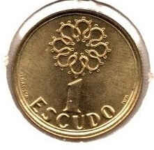 The 1 Escudo de Portugal coin features the Portuguese shield on the obverse, with five corners and seven crowns. On the reverse, there is the inscription “1 ESCUDO” and the year of issue.