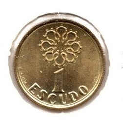 The 1 Escudo de Portugal coin features the Portuguese shield on the obverse, with five corners and seven crowns. On the reverse, there is the inscription “1 ESCUDO” and the year of issue.
