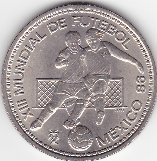 The 1986 Portuguese 100 Escudos coin, issued to commemorate the World Cup in Mexico, is composed of copper-nickel and is 33.5 mm in diameter. The circulation was 500,000 copies. The design celebrates the sporting event, highlighting football and the spirit of competition.
