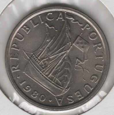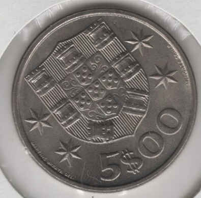Portugal’s 5 escudo coin is made of cupronickel. On the obverse, it displays the national shield, while the reverse features a caravel, symbolizing the Portuguese Discoveries and the maritime era that marked the country’s history.
