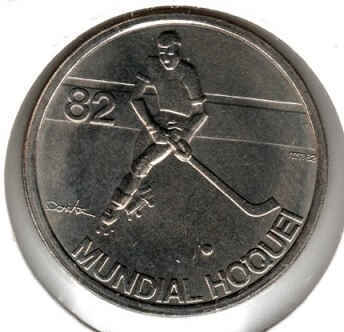 The 5 Portuguese Escudos coin, issued in 1982 to commemorate Roller Hockey, weighs 9.5g, is 26.5mm in diameter and is made of cupronickel. It was issued to honor the World Hockey Championship.