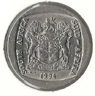 The South African 5 Rand coin, issued in 1994, weighs 12g, is 32.7mm in diameter and is made of cupronickel. It commemorates the country’s democratic transition and features a wildebeest antelope.