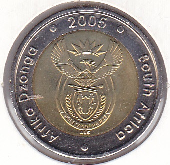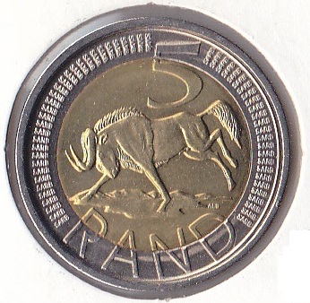 The South African 5 Rand bimetallic coin, issued in 1995, weighs 12g and is 26mm in diameter. Made with a cupronickel core and brass-nickel ring, it features the wildebeest antelope and is intended for common circulation.