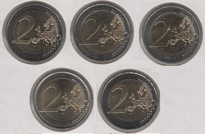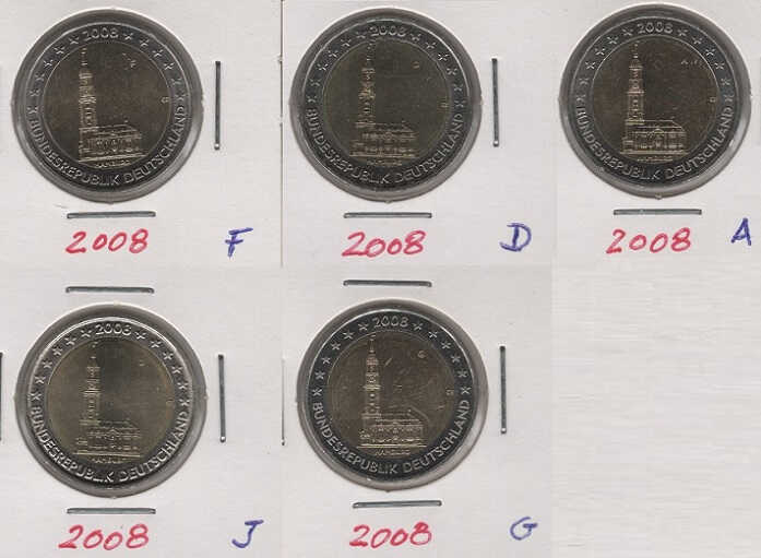 Germany 2 Euro 2008 Hamburg (Set of 5 coins) which includes all letters: A Berlin (former Kingdom of Prussia); D Munich (former Kingdom of Bavaria); F Stuttgart (former Kingdom of Wuerttemberg); G Karlsruhe (Former Grand Duchy of Baden); J Hamburg (Hanseatic City of Hamburg).