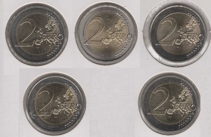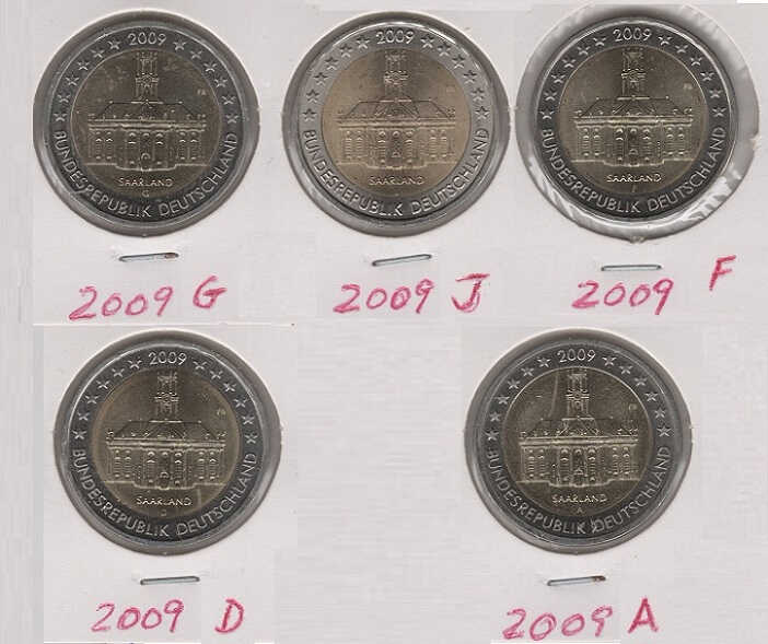 Germany 2 Euro 2009 – Saarland (Set of 5 coins) which includes all letters: A Berlin (former Kingdom of Prussia); D Munich (former Kingdom of Bavaria); F Stuttgart (former Kingdom of Wuerttemberg); G Karlsruhe (Former Grand Duchy of Baden); J Hamburg (Hanseatic City of Hamburg).