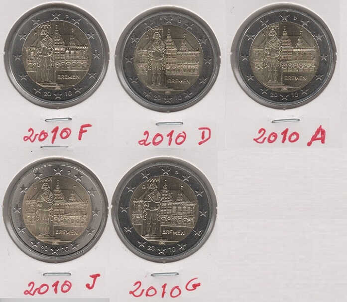 Germany 2 Euro 2010 Bremen (Set 5 coins) which includes all letters: A Berlin (former Kingdom of Prussia); D Munich (former Kingdom of Bavaria); F Stuttgart (former Kingdom of Wuerttemberg); G Karlsruhe (Former Grand Duchy of Baden); J Hamburg (Hanseatic City of Hamburg).