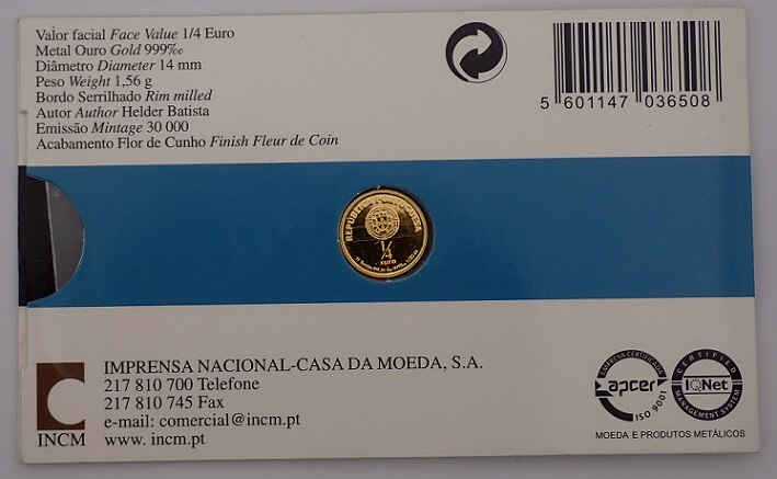 The 2007 1/4 Euro commemorative coin dedicated to Saint Anthony of Lisbon is part of the “Portugal Universal” series. It was produced by INCM with 999 thousandths gold, weighing 1.56 g and 14 mm in diameter. Its stylized design pays homage to Saint Anthony, highlighting its historical and cultural importance, with a circulation of 30,000 copies.