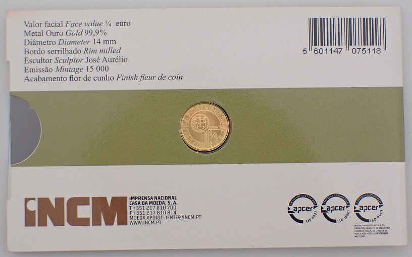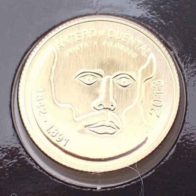 The Portugal 1/4 Euro 2013 coin honors Antero de Quental as part of the Portugal Universal series. Made of gold (99.9%), it weighs 1.56 g and has a diameter of 14 mm, with an issue limited to 15 thousand copies.