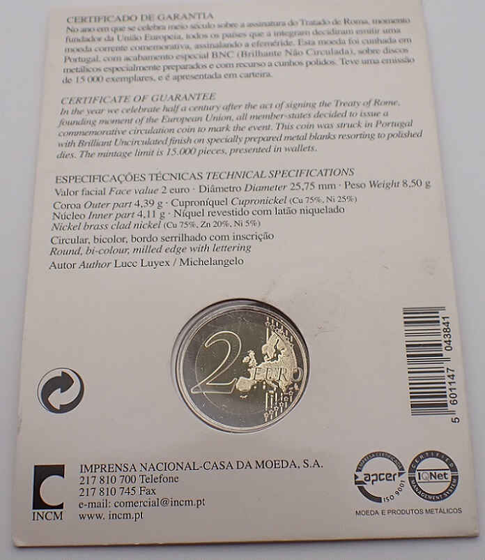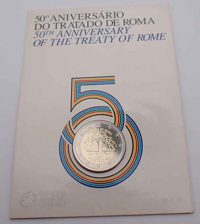 Portugal’s 2-euro coin from 2007 commemorates the 50th anniversary of the Treaty of Rome. Presented in a BNC version, it symbolizes the founding of the European Union and the integration of the European peoples. Mintage: 15,000.