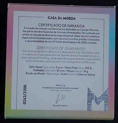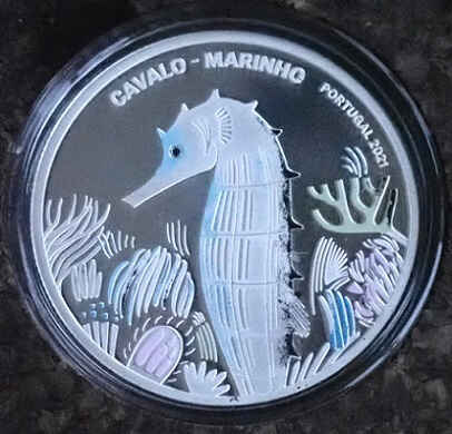 Portugal’s 2021 5 euro coin, “SeaHorse”, in the Proof version, has a diameter of 30 mm, weighs 14 g and is made of silver (925‰). The issue was limited to 2,500 copies, highlighting endangered marine fauna.
